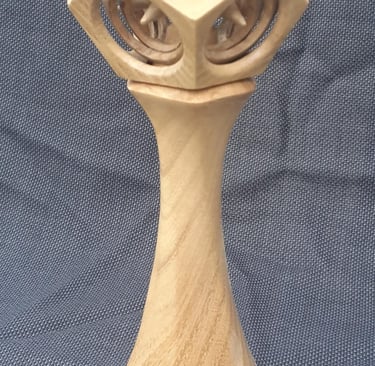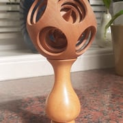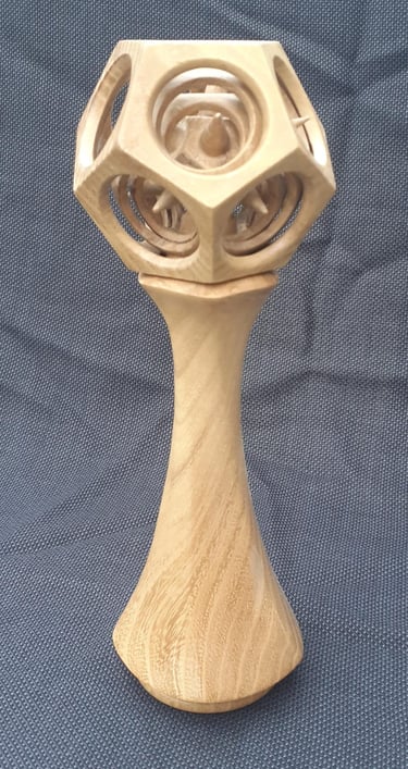 Tour de Force woodturning in Honey Locust. Spiked dodecahedron within 2 concentric spheres within a dodecahedron outer shell. The sphere is turned on the lathe from a single piece of wood. The stand is 5 sided with a twist using multi-axis method.