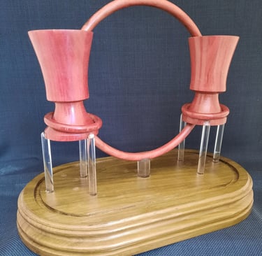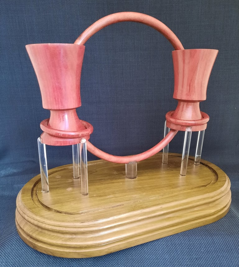 Captive Goblet Ring made from a solid piece of Purple Heart, the large ring was separated from the goblets then the goblets shaped and captive rings formed around the stems. This item could not be made using conventional woodturning techniques. I had to devise custom made tools, jigs and novel ways to manipulate and cut the workpiece.