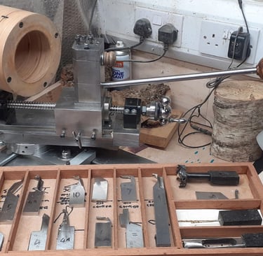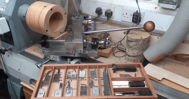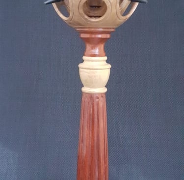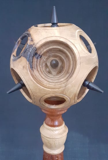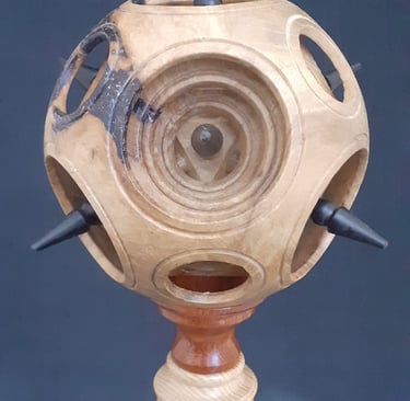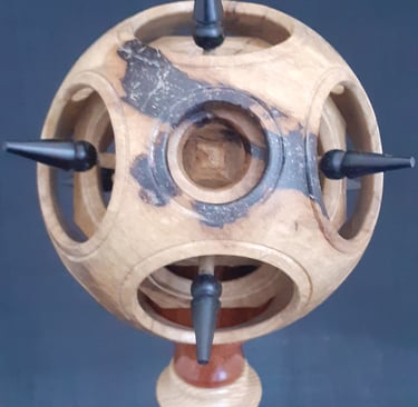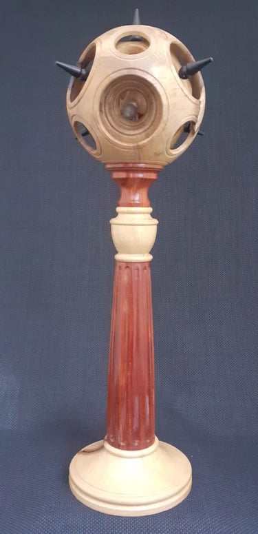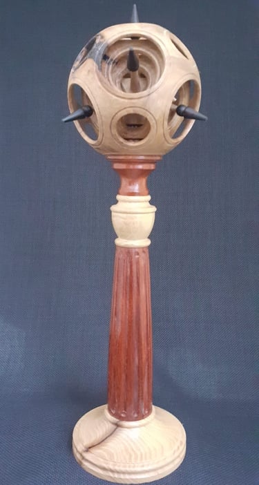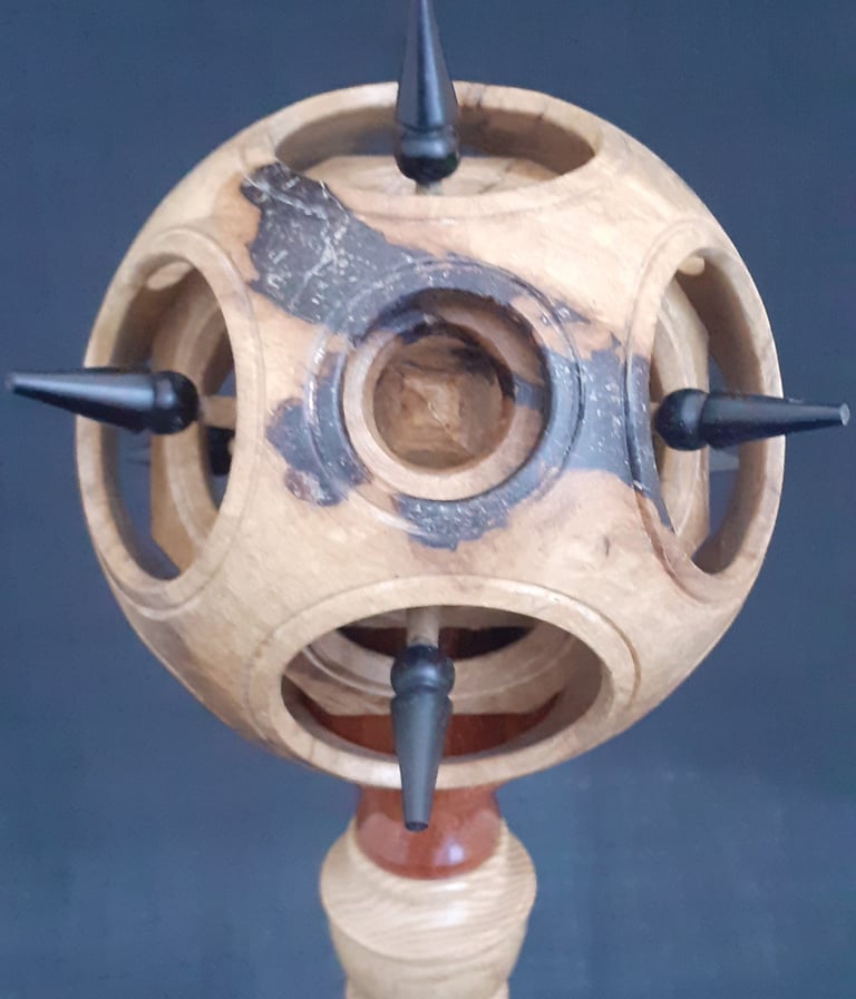 Inspiration for this original piece was taken from the website of Robert Bosco. A challenging piece to make as the wood had bark inclusions and could have fell apart. also the openwork Octahedron is oversize extending to the surface of the Truncated Octahedron. There are threaded steel pins inside the spikes so the ebony finials could be screwed in position.