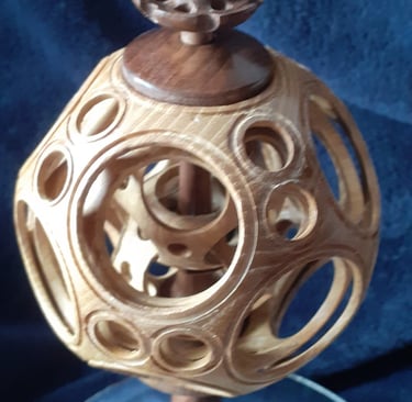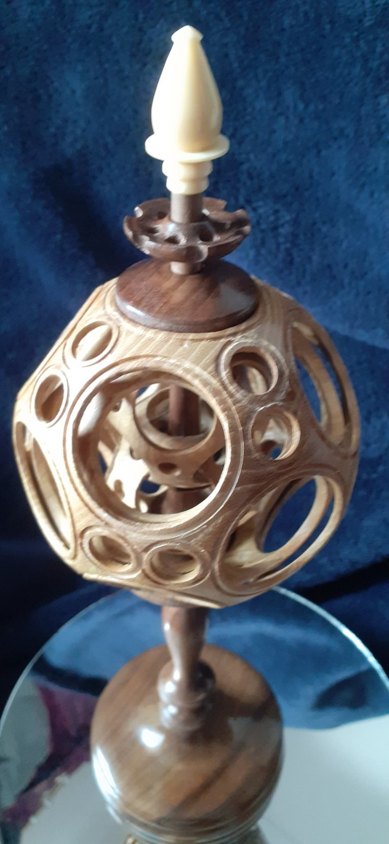 The sphere is made in one piece from Honey Locust wood. The stand is Black Walnut with a Tagua nut Finial