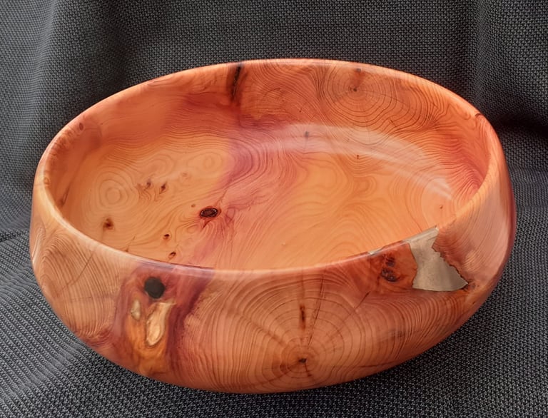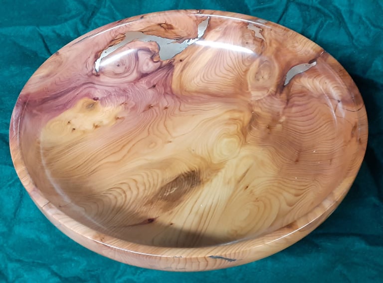 English Yew shallow bowl with brass accents