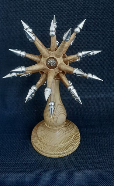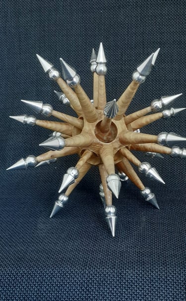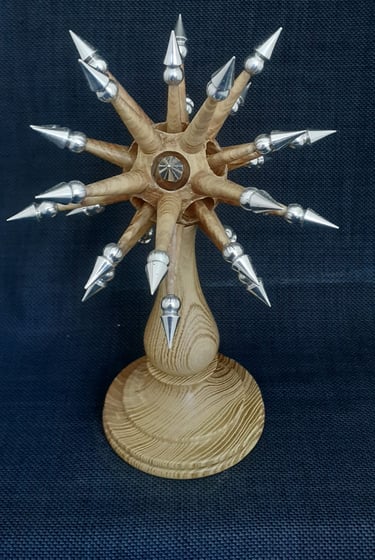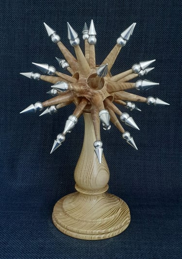 "Supernova" a 12 spiked sphere within a 20 spiked sphere with aluminium finials on Honey Locust
