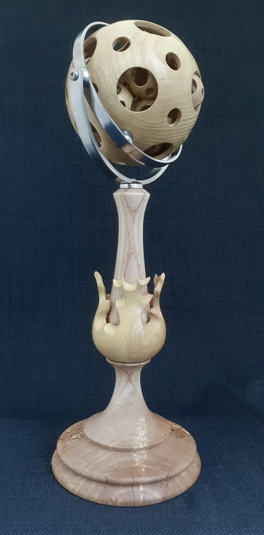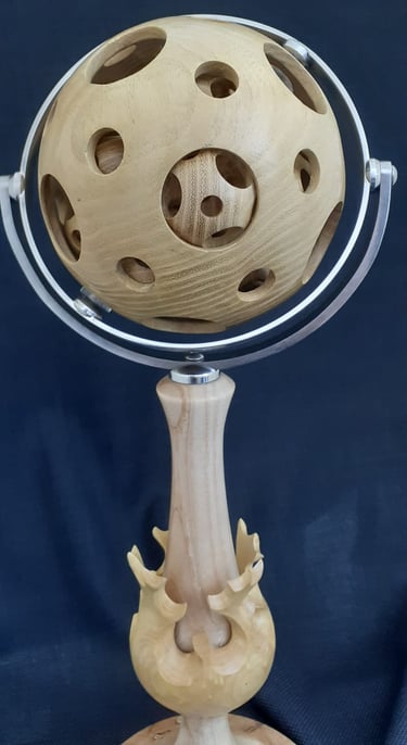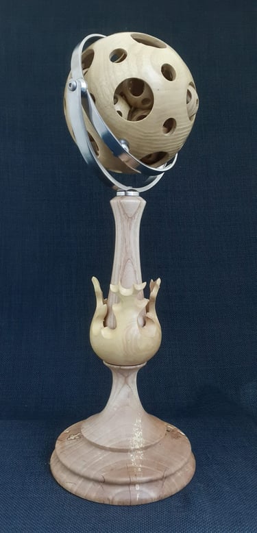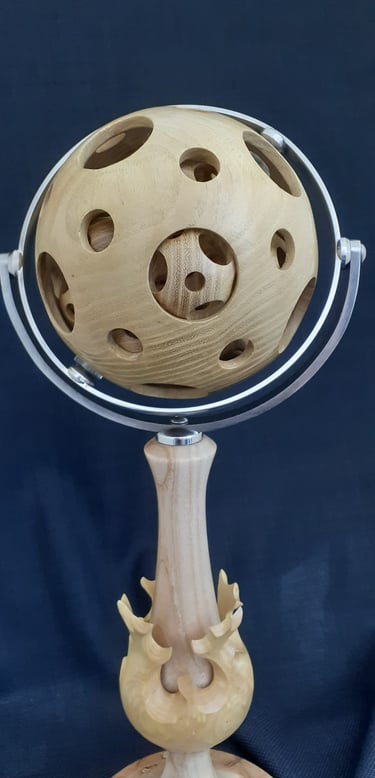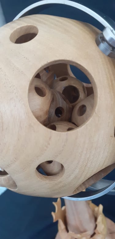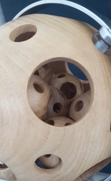Continuing my adventure in woodturning, a 138mm sphere with 13, 40mm spheres turned inside, all made from one piece of Honey Locust.